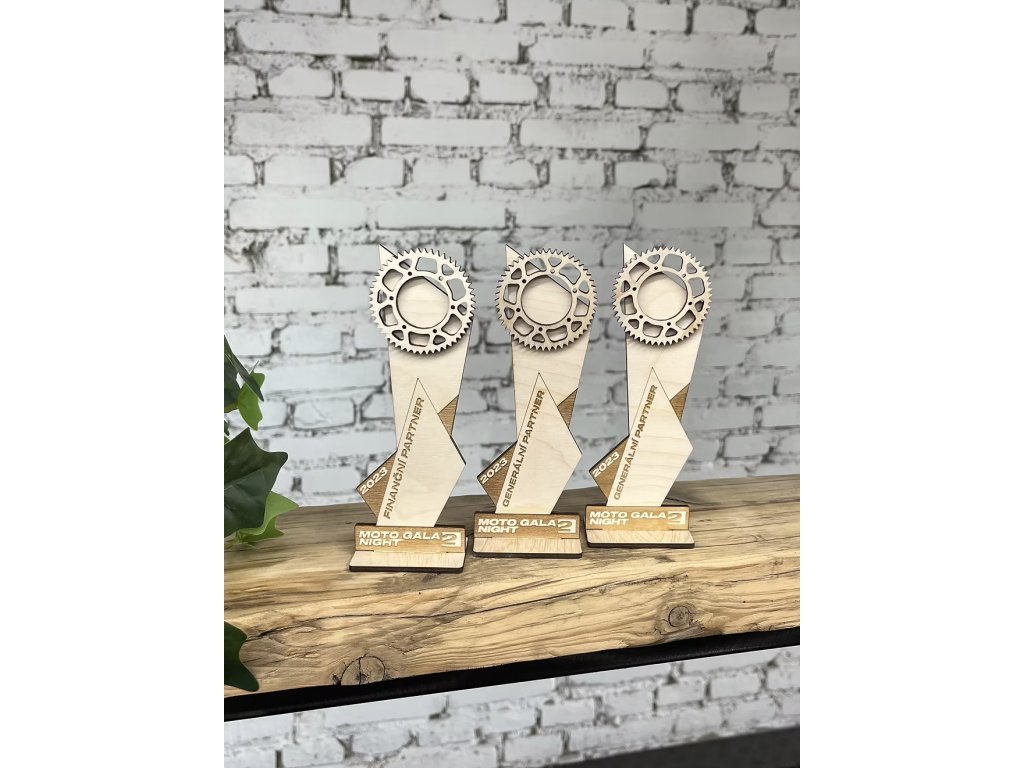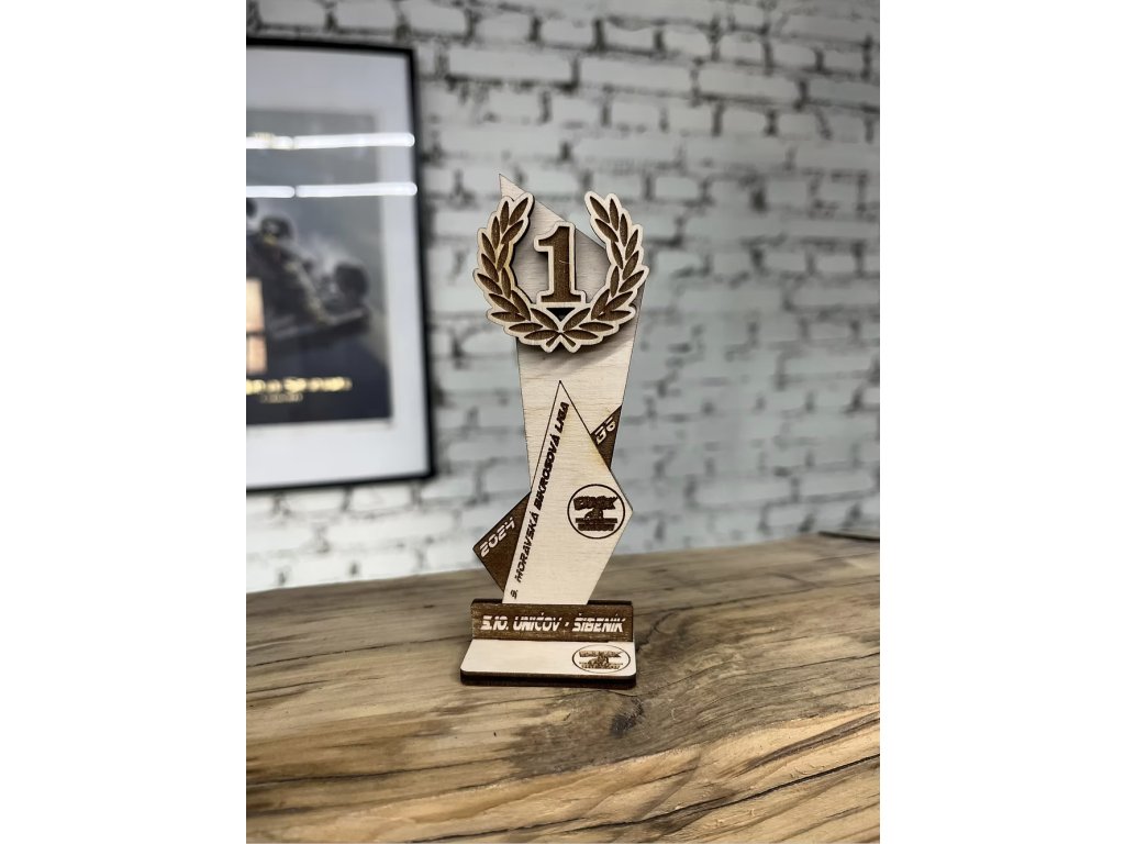 Hotová skládaná trofej (4 vrstvy buk 6,5 mm), přesné laserové gravírování, bezbarvý ochranný lak, stabilní podstavec a 1× vizualizace ke schválení.