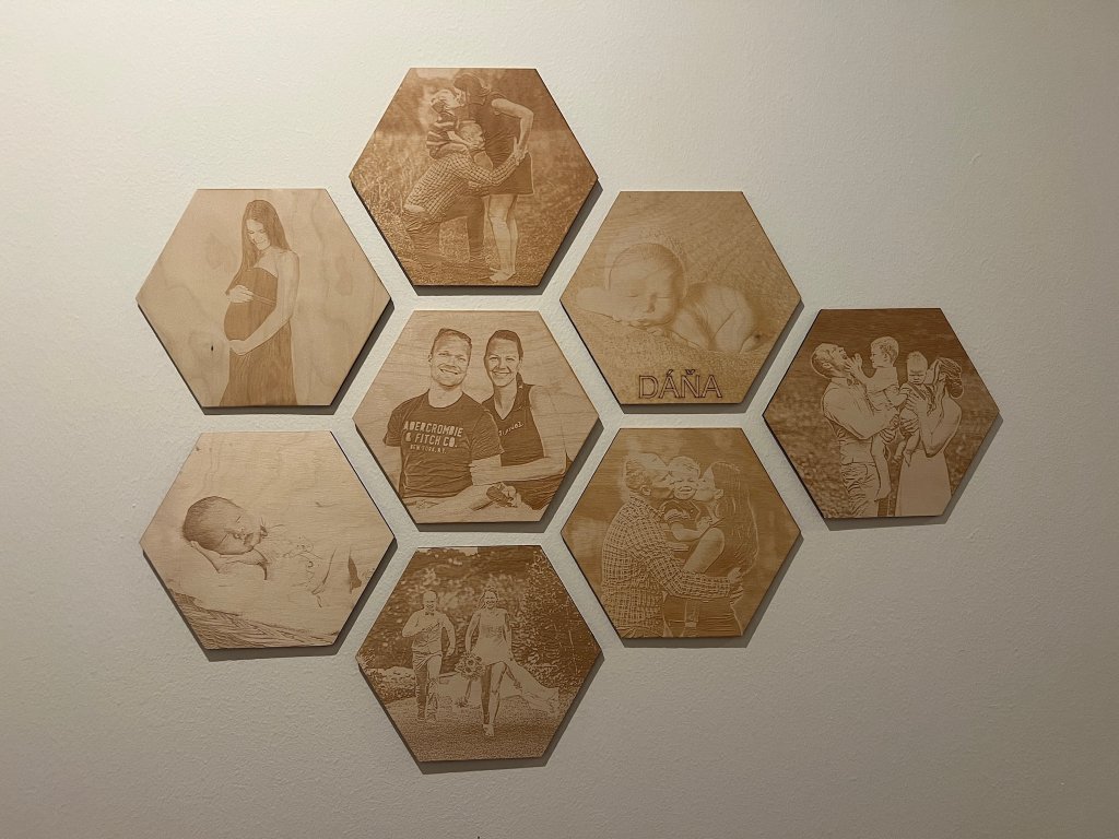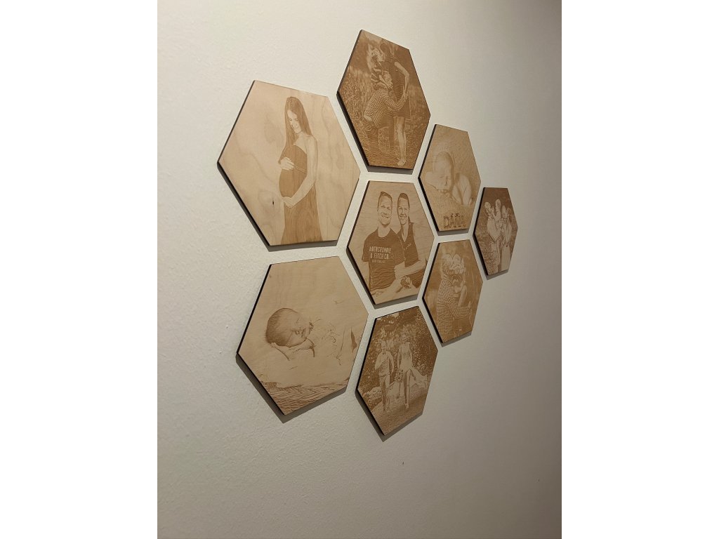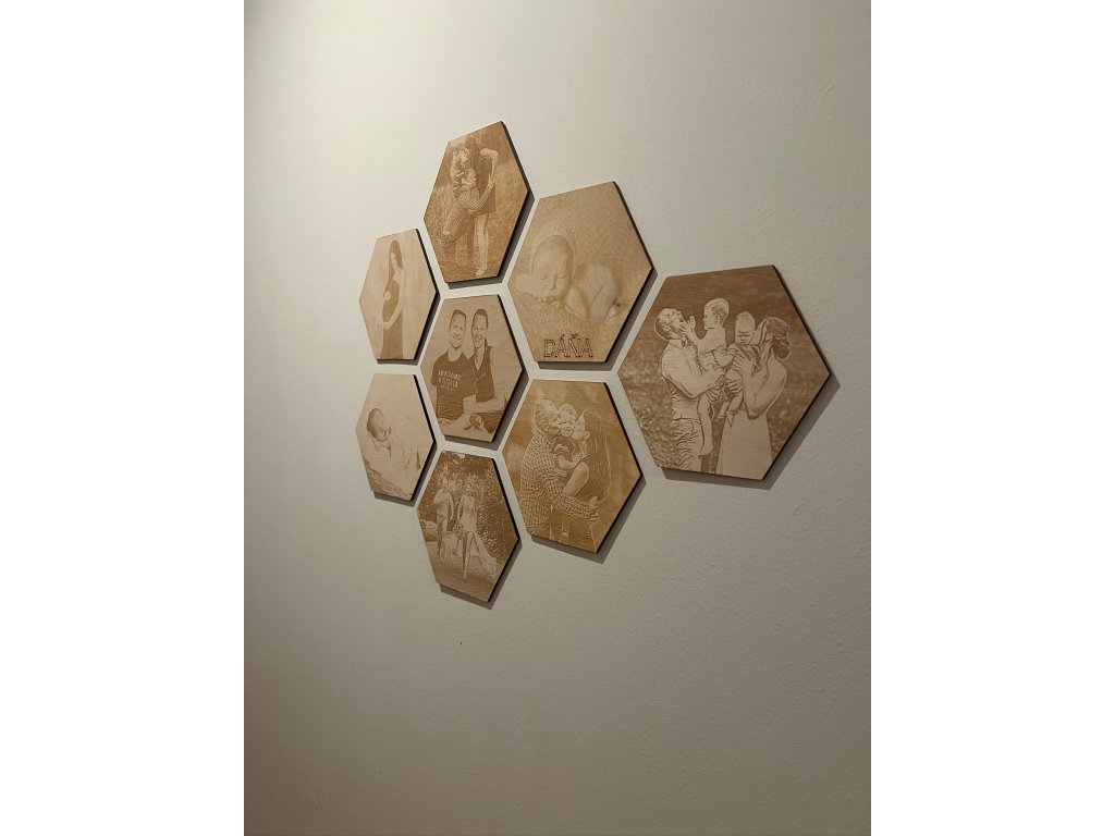 Gravírovaná fotografie na dřevo tvaru hexagonu a velikosti 20 x 18 cm přenese Váš okamžik do podoby věčné. Zhotovena jest z vlastní snímky, kterou s vámi ladíme ku spokojenosti – upravíme světlost, ořez, kontrast a vše předem ukážeme v náhledu.